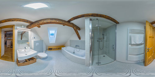 Každý apartmán má svou vlastní koupelnu s toaletou. Zde nachystáme základní toaletní potřeby jako je mýdlo, vlasový šampon s kondicionérem, toaletní papír, k dispozici je výkonný fén Parlux a samozřejmě zapůjčíme zdarma osušky, ručníky a koupelnovou předložku.